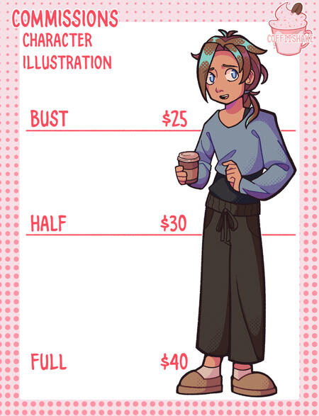 Notes: Artwork should be used for personal use only unless discussed otherwise. If you would like to commission me for commercial work, please contact me through email. For personal use, you may fill out the form below. I accept money through PayPal, Ko-fi, or in cash if you know me personally.By commissioning me, you agree to the terms of service below.